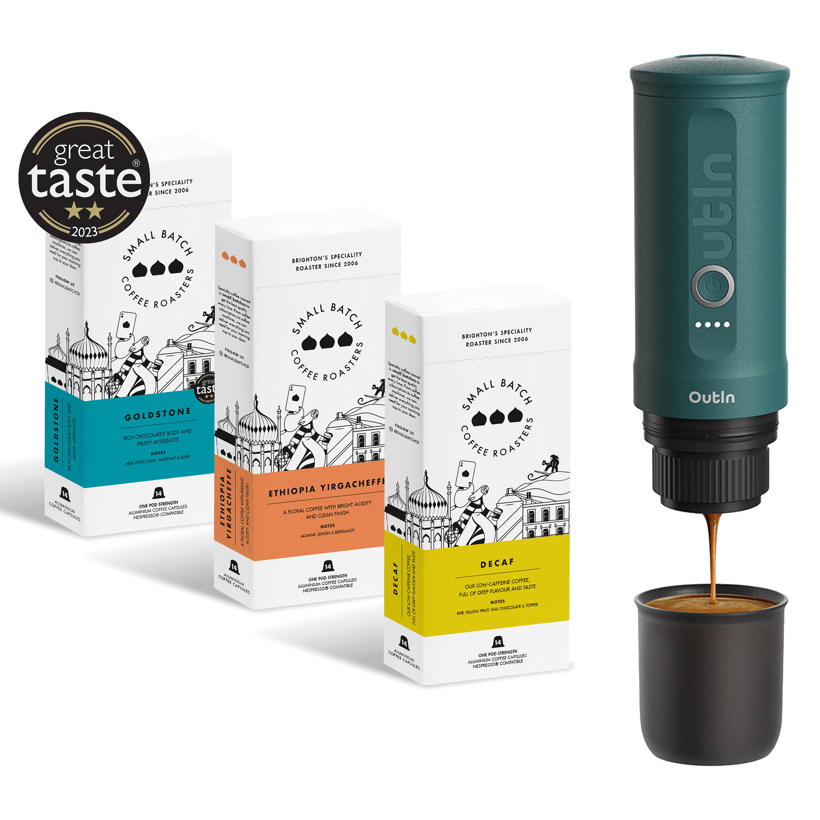 Kit include: 1x Coffee Pod Trio (your flavour of choice), 1x OutIn Machine